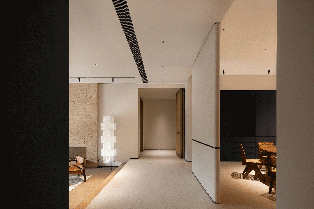 空间内到处可见的留白是设想付与栖身者思虑的维度,同时也是空间灵动感的源泉,淡色地毯、L型沙发、皮革躺椅让家充盈且适用了起来。